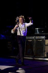 From beloved hits that span the course of his impressive career including rousing renditions of “Drive My Car,” “Band on the Run,” and “Live and Let Die,” and many others, McCartney switches instruments several times throughout. Effortlessly he moves from a ukulele that was given to him by George Harrison to the piano and several guitars including one enviable brightly colored electric model on which he wails Hendrix's “Foxy Lady." And at the same time, Paul McCartney proves that his vocal and instrumental musicality is still top-notch even after all these years.